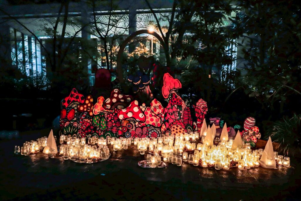 色鮮やかなキノコや動物の書き割りの中にランタンが優しく照らします。